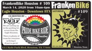 FrankenBike Houston # 109 – Presented by Roland Bikes, Bike Texas, The Energy Corridor District, and Independence Brewing Company will be held on SATURDAY, March 14, 2020 from 10am-4pm at the Eagle Houston – 611 Hyde Park Blvd, Houston, Texas 77006 – in conjunction with the Pride Bike Ride of Houston. (see map below) David […]