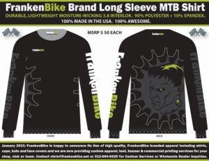 FrankenBike is happy to announce Its line of high quality, FrankenBike branded apparel including shirts, caps, hats and face covers and we are now providing custom apparel, tent, banner & commercial printing services for your shop, club or team. Contact chris@frankenbike.net or 512-694-6529 for Custom Services or Wholesale Dealer Inquiries.
