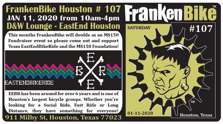 EEBR has been around for over 6 years and is one of Houston’s largest bicycle groups. Whether you’re looking for a Social Ride, Fast Ride or Long Distance, they have something for everyone! This months FrankenBike will double as an MS150 Fundraiser event so please come out and support Team EastEndBikeRide and the MS150 Foundation! All Bike Clubs, Bike Groups, Bike Shops and individuals are welcome to set up a booth and sell their merchandise, bike parts, and snacks. Contact Judith to find out about future EEBR rides and events. @EastEndBikeRide