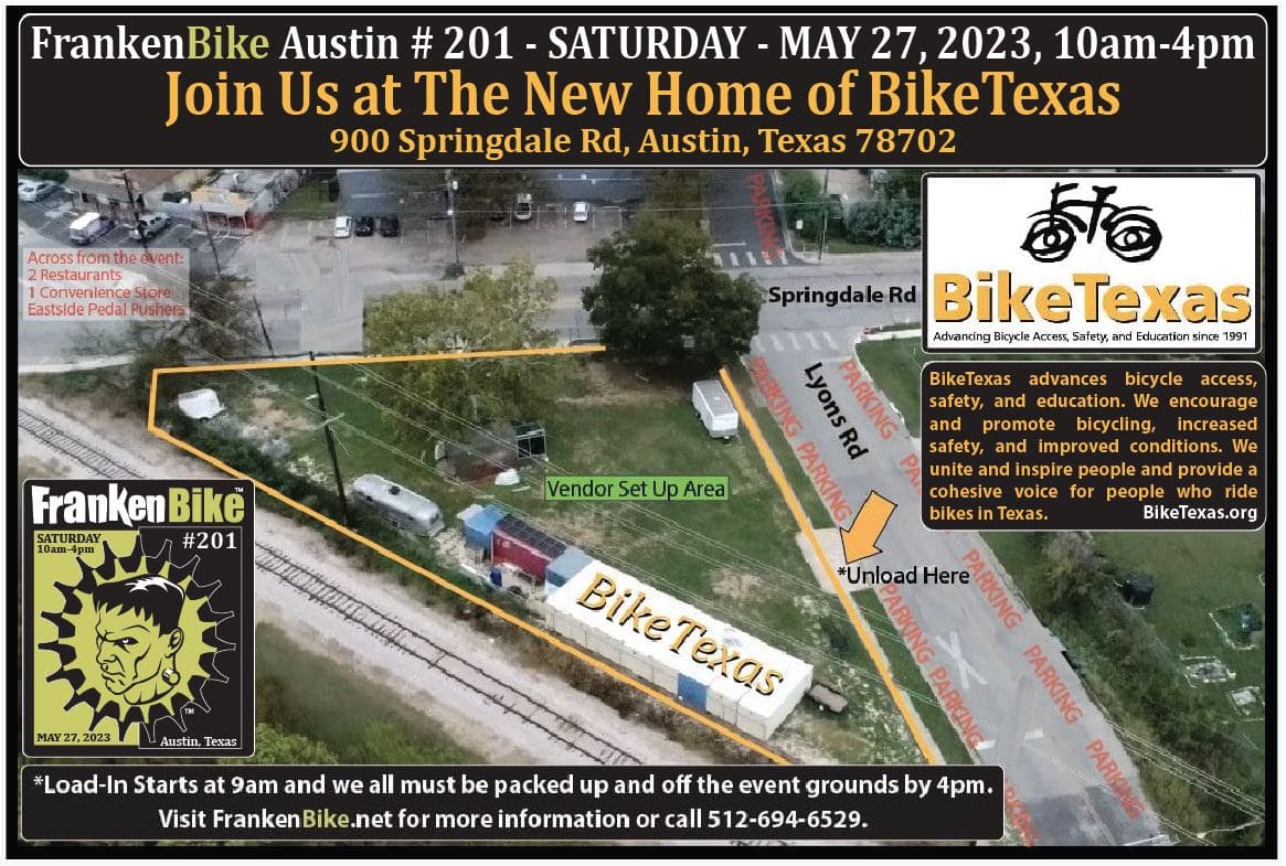 FrankenBike Austin # 201 – Presented by BikeTexas, Independence Brewing Company, Trudy’s, Ruta Maya Coffee and Junior’s Beer and Wine – will be held at the future home of BikeTexas on SATURDAY, MAY 27, 2023 from 10am-4pm.