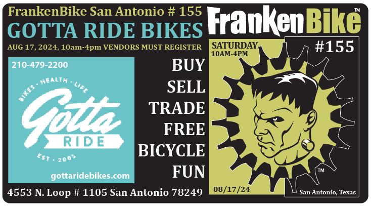 FrankenBike San Antonio #155 – Presented by BikeTexas, Independence Brewing Company, Ruta Maya Coffee and Club Sirius – will be held on Saturday, August 17, 2024 from 10am-4pm at GOTTA RIDE BIKES located at 4553 N Loop 1604 W #1105, San Antonio, Texas 78249. (Scroll Down for a map.)