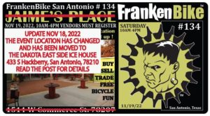 FrankenBike San Antonio #134: SATURDAY, November 19, 2022 from 10am-4pm at Jaime’s Place ALL VENDORS MUST REGISTER