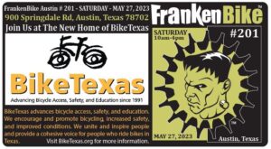FrankenBike Austin # 201 – Presented by BikeTexas, Independence Brewing Company, Trudy’s, Ruta Maya Coffee and Junior’s Beer and Wine – will be held at the future home of BikeTexas on SATURDAY, MAY 27, 2023 from 10am-4pm. BikeTexas is located at 900 Springdale Rd, Austin, Texas 78702. Scroll down for a map. Another BikeTexas Live […]