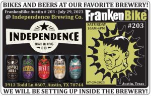 FrankenBike Austin # 203 – Presented by BikeTexas, Independence Brewing Company, Trudy’s, Ruta Maya Coffee and Junior’s Beer and Wine – will be held at Independence Brewing Company on SATURDAY, July 29, 2023 from 10am-4pm. Scroll down for a map. No outside adult beverages. Food will be for sale starting at noon and you are […]