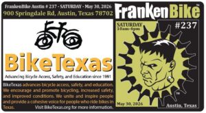 FrankenBike Austin # 237 – Presented by BikeTexas, Independence Brewing Company, and Ruta Maya Coffee – will be held at BikeTexas on SATURDAY, May 30, 2026 from 10am-4pm. BikeTexas is located at 900 Springdale Rd, Austin, Texas 78702. Scroll down for a map. FrankenBike is free for Buyers and Sellers alike. Buyers, there are always […]