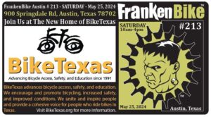 FrankenBike Austin # 213 – Presented by BikeTexas, Independence Brewing Company, Trudy’s, Ruta Maya Coffee and Junior’s Beer and Wine – will be held at the future home of BikeTexas on SATURDAY, May 25, 2024 from 10am-4pm. BikeTexas is located at 900 Springdale Rd, Austin, Texas 78702. Scroll down for a map. FrankenBike is free […]